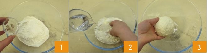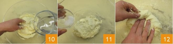 amasse todos os ingredientes, adicionando a água aos poucos 10. Quando a mistura estiver homogênea, adicione o sal 11, continue amassando até que seja absorvido, então transfira a massa para uma superfície ligeiramente enfarinhada com farinha de sêmola 12