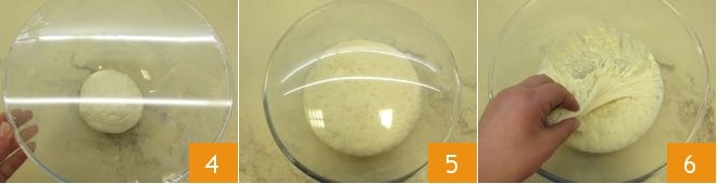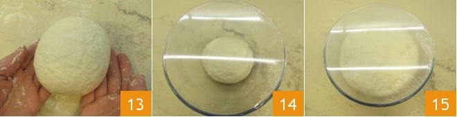 Trabalhe-a para formar uma bola 13, coloque a massa em uma tigela grande, cubra com filme plástico 14 e deixe levedar a uma temperatura de cerca de 26-27 °C: será bom conservá-la em forno desligado com a luz acesa, por cerca de 3 horas ou até que a massa triplique de volume 15.