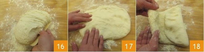 Após o tempo de fermentação, coloque a massa sobre uma superfície ligeiramente enfarinhada com farinha de sêmola 16, estenda a massa para criar um retângulo pressionando com os dedos a massa 17, agora faça as dobras: pegue as bordas laterais da massa e dobre-as sobre si mesmas 18