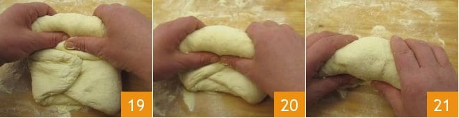 para dar novamente uma forma esférica 22, coloque a esfera obtida sobre uma tábua polvilhada com farinha de sêmola 23, cubra a massa com uma tigela ou uma cúpula para bolos 24 e deixe levedar por mais 1 hora. Desta forma, será mais prático transferir a massa para a assadeira uma vez levedada.