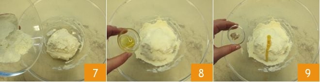Neste ponto adicione a farinha de sêmola 7, o mel 8, 1 g de fermento de cerveja fresco 9