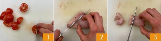 Para preparar a massa com peixe-espada, primeiro coloque no fogo uma panela com água salgada que será usada para cozinhar a massa. Enquanto isso, lave os tomatinhos e corte-os em quartos (ou ao meio) 1. Remova a pele do peixe-espada e corte-o primeiro em fatias 2 e depois em cubos de aproximadamente 1,5 cm 3.
