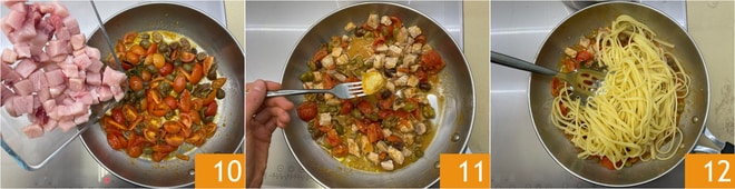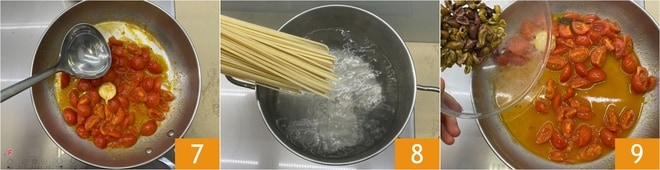 Adicione um pouco de água para a massa 7 e cozinhe em fogo médio-alto por alguns minutos. Enquanto isso, mergulhe o linguine na água fervente 8. Enquanto a massa cozinha, adicione as azeitonas aos tomatinhos 9.