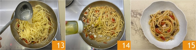 Adicione uma concha da água de cozimento 13 e salteie tudo para misturar. Finalmente, com o fogo desligado, finalize com um fio de óleo 14. Sua massa com peixe-espada está pronta para ser servida 15!
