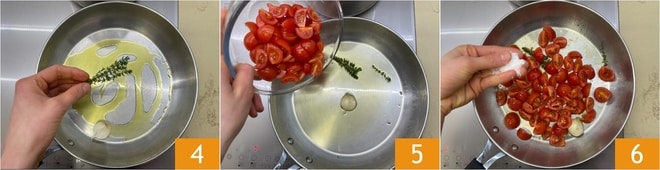 Em uma frigideira grande, aqueça o óleo com o dente de alho e os ramos de tomilho 4, depois adicione os tomatinhos 5. Salgue 6 e apimente.