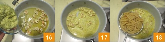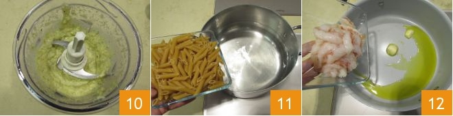 em seguida, bata até obter uma consistência bastante cremosa 10. Neste ponto, a água estará fervendo, então adicione a massa 11 e cozinhe pelo tempo indicado na embalagem. Enquanto isso, cozinhe os camarões: em uma frigideira, refogue rapidamente os dentes de alho com o azeite, depois adicione os camarões 12 e salteie por alguns minutos em fogo médio.