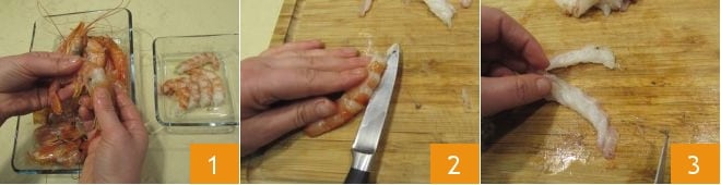 Para preparar as pennette ao pesto de amêndoas e camarões, primeiramente limpe os camarões: enxágue-os em água corrente, remova a cabeça e a carapaça 1, depois corte o camarão descascado ao meio no sentido do comprimento 2 e puxe delicadamente com a ponta da faca o fio preto que está dentro, ou seja, o intestino 3. Para mais dicas, você pode consultar nossa escola de culinária sobre como limpar camarões.
