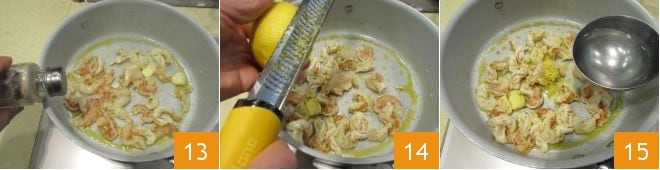 Ajuste o sal e a pimenta 13, rale cerca de metade da casca restante do limão que você usou para o pesto 14 e adicione uma concha da água de cozimento da massa 15, em seguida, desligue o fogo.