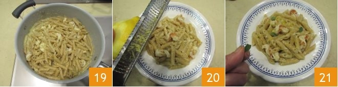 Misture para integrar bem a massa ao molho 19, sempre com o fogo desligado, adicionando, se necessário, mais uma concha da água de cozimento da massa. Transfira a massa assim temperada para o prato de servir, adicione o restante da casca ralada do limão 20 e algumas folhas de manjerona 21: suas pennette ao pesto de amêndoas e camarões estão prontas para serem servidas bem quentes!