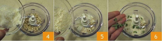 Depois de limpar todos os camarões, coloque uma panela com água no fogo para cozinhar a massa e comece a preparar o pesto de amêndoas: coloque as amêndoas peladas em um mixer, adicione o Grana ralado 4, o pecorino ralado 5, as folhas de manjerona 6,