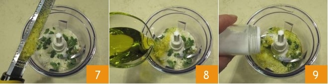 a casca ralada de meio limão (cuidado para pegar apenas a parte amarela) 7, o azeite de oliva extra virgem 8, sal 9 e pimenta,
