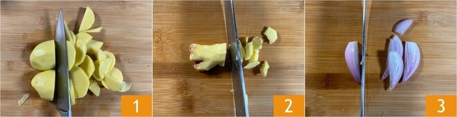 Para servir os pennoni com creme de batatas e cogumelos à mesa, comece preparando o creme de batatas: descasque as batatas e corte-as em fatias bem finas 1. Descasque o gengibre e fatie-o finamente 2, depois faça o mesmo com o chalota 3.