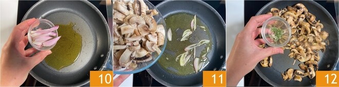 Aqueça o azeite em uma frigideira e refogue a chalota 10, depois adicione os cogumelos 11, salgue e perfume com alecrim picado e tomilho desfolhado 12. Cozinhe em fogo médio-alto por 4-5 minutos.