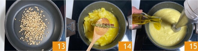 Enquanto isso, leve a uma panela com água salgada para ferver para cozinhar a massa e toste os pinhões em uma frigideira separada 13. Após o tempo de cozimento das batatas 14, retire o maço aromático e bata com um mixer de imersão enquanto despeja os restantes 25 g de azeite aos poucos 15. Você deve obter um creme homogêneo.