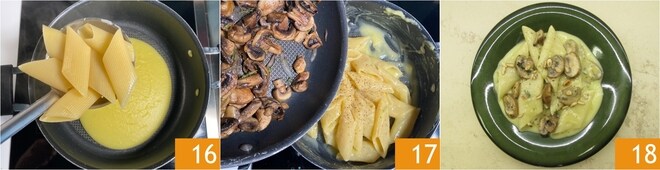 Cozinhe a massa al dente e despeje metade do creme de batatas em uma panela. Escorra a massa na panela 16 e misture bem, adicionando uma concha da água de cozimento. Adicione também metade dos cogumelos 17, misture e tempere com pimenta. Você está pronto para servir: distribua uma concha de creme de batatas no fundo, depois adicione a massa temperada e um pouco dos cogumelos restantes. Complete com os pinhões tostados, um fio de azeite cru, pimenta e ervas aromáticas a gosto. Seus pennoni com creme de batatas e cogumelos estão prontos para serem servidos 18!