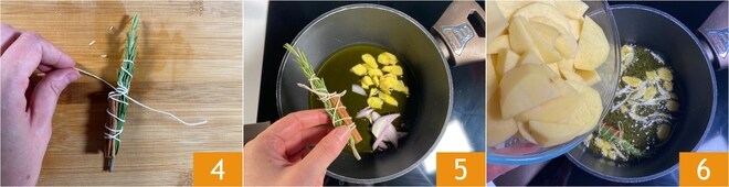 Por fim, amarre o alecrim e a canela com barbante de cozinha para que o alecrim não perca as agulhas durante o cozimento 4. Aqueça 25 g de azeite em uma panela não muito grande e frite por um minuto o gengibre, a chalota e o maço aromático 5, depois adicione as batatas 6. Salgue, mexa e doure as batatas por alguns minutos.