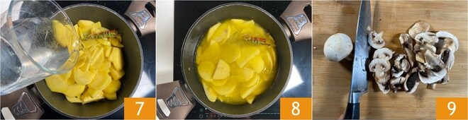 Despeje a água na panela até cobrir as batatas 7 e cozinhe por 20-25 minutos 8, adicionando mais água se necessário. Enquanto isso, limpe os cogumelos e corte-os em fatias de cerca de 6 mm de espessura 9. Limpe a chalota e corte-a em fatias no sentido do comprimento.
