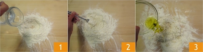 Para preparar os pici toscanos, coloque a farinha sobre uma bancada e crie a clássica forma de vulcão. Primeiro, despeje a água 1 e comece a misturar com um garfo 2. Em seguida, adicione também o óleo 3.