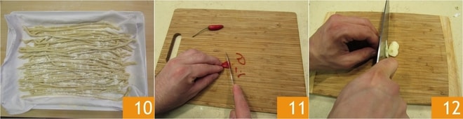 Coloque-os gradualmente em uma bandeja com um pano bem enfarinhado para não grudarem entre si 10. Agora passe para o molho. Corte em fatias tanto a pimenta 11 quanto os dentes de alho 12.
