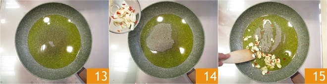 Despeje o azeite de oliva em uma panela antiaderente 13, depois adicione os dentes de alho e a pimenta 14. Deixe cozinhar em fogo baixo por cerca de 15-20 minutos para que o alho cozinhe suavemente. Quando estiver macio, esmague-o 15.