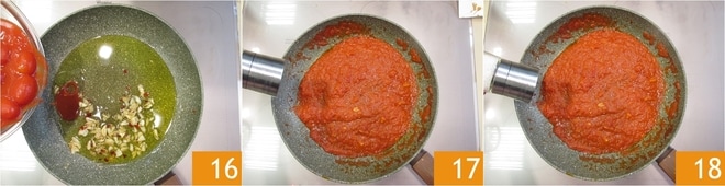 Adicione a polpa de tomate 16 e o sal 17. Deixe cozinhar por mais 15 minutos 18.
