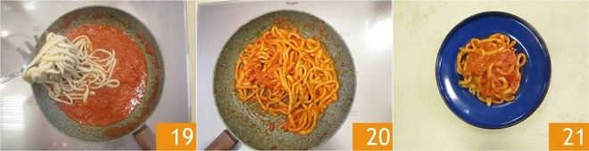 Cozinhe os pici em bastante água salgada por cerca de 6-7 minutos, depois escorra-os e coloque-os no molho 19. Misture bem os pici, salteando-os 20, e sirva-os 21.