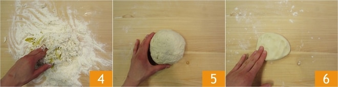Sove por cerca de 6-7 minutos 4, até obter uma massa homogênea 5. Envolva em filme plástico e deixe descansar por 30 minutos. Após os 30 minutos, pegue uma parte da massa e esprema-a primeiro com as mãos 6.