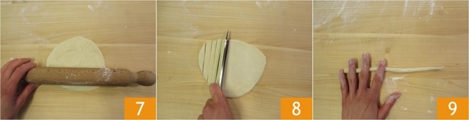 Estenda-a com um rolo até atingir uma espessura de cerca de 1 cm 7 e corte em tiras com cerca de 1 cm de largura 8. Agora forme os pici: enrole as tiras individualmente sobre a superfície de trabalho para formar espaguetes grandes e longos 9.