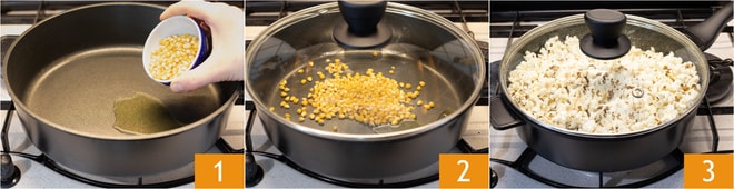 Para preparar os popcorns com caramelo salgado, coloque um fio de óleo em uma panela grande com fundo espesso e bordas altas. Sem aquecer, adicione os grãos de milho 1. Acenda o fogo e mantenha em chama alta, cubra a panela com uma tampa 2. Após cerca de 3 minutos, os popcorns começarão a estourar, agite a panela e coloque de volta no fogo em chama moderada, continue a agitar frequentemente até que parem de estourar: isso levará cerca de 10 minutos 3.
