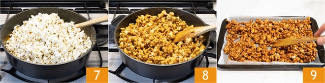 Adicione imediatamente os popcorns 7 e misture mexendo continuamente para que o caramelo os envolva bem 8. Desligue o fogo e transfira os popcorns caramelizados para uma assadeira coberta com papel manteiga 9, com a ajuda da espátula ou de uma colher de pau, tente separá-los para deixá-los endurecer. Assim que estiverem frios e cristalizados, os popcorns caramelizados estarão prontos para serem saboreados 9!