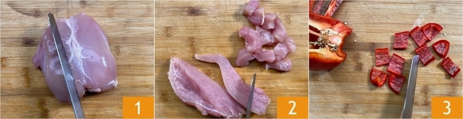 Para preparar o frango ao molho agridoce, primeiro prepare os ingredientes: limpe o peito de frango retirando cartilagem e ossinhos 1, depois corte-o em cubos de cerca de 2,5 cm 2. Limpe o pimentão e corte-o em pedaços do mesmo tamanho 3.