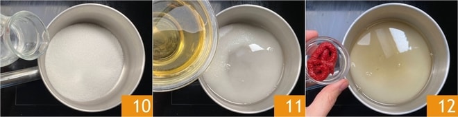 Reserve a massa e prepare o molho agridoce: em uma panela, coloque o açúcar junto com a água 10 e o vinagre de vinho branco 11, depois acenda o fogo em temperatura média-alta e deixe o açúcar dissolver. Agora adicione o extrato de tomate 12, misture com o batedor e cozinhe por alguns minutos.