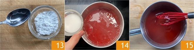 Enquanto isso, misture em uma tigelinha à parte o amido de batata e 2 colheres de chá de água 13. Adicione a mistura ao molho aos poucos, sempre mexendo 14. Deixe engrossar no fogo por alguns instantes, depois reserve 15.