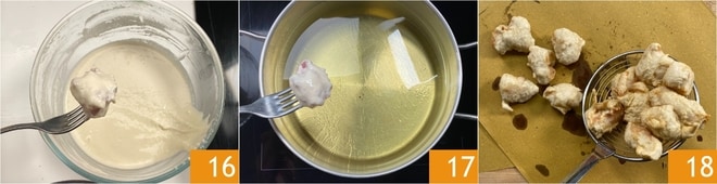 Você está pronto para fritar: aqueça o óleo até a temperatura de 170°, depois cubra os pedaços de frango com a massa, deixando cair o excesso 16. Mergulhe poucos pedaços por vez no óleo quente 17 e frite por 3-4 minutos. Uma vez dourados, escorra os pedaços sobre papel absorvente e reserve 18.