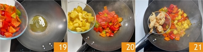 Após fritar o frango, aqueça bem um wok, depois adicione o óleo, os pimentões 19 e o abacaxi 20. E doure em fogo alto por 8-9 minutos. Adicione os pedaços de frango fritos 21 e salteie tudo por um par de minutos.