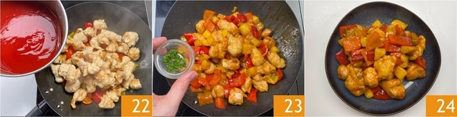 Neste ponto, despeje o molho agridoce na panela 22 e misture, salteando brevemente tudo. Desligue o fogo e aromatize com cebolinha picada 23, em seguida, seu frango ao molho agridoce está pronto para ser servido 24!