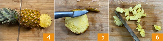 Por fim, elimine a base e a coroa do abacaxi 4, depois corte-o em fatias, remova a casca 5 e reduza 230 g de polpa em cubos, também com cerca de 2,5 cm 6.