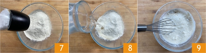 Passe para a massa: coloque a farinha em uma tigela e adicione o sal 7, depois despeje a água aos poucos enquanto mexe com um batedor 8 até obter uma mistura homogênea e sem grumos 9.