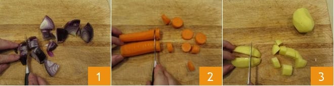 Para preparar o purê de legumes, comece preparando todos os vegetais: descasque a cebola roxa e corte-a em pedaços grandes, descasque as cenouras e corte-as em rodelas grossas 2, descasque as batatas e corte-as também em cubos do tamanho das cenouras 3.