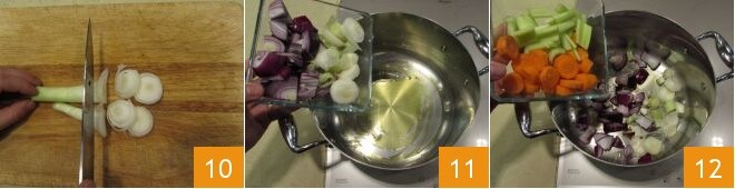 Agora pegue a cebolinha: corte a base e fatie-a grosseiramente também 10. Os vegetais estão prontos para o cozimento: em uma panela de borda alta aqueça o óleo de oliva, depois adicione a cebola, a cebolinha 11, a cenoura e o aipo 12 e deixe dourar por 2-3 minutos