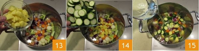 Em seguida, adicione as batatas 13, as abobrinhas 14 e cubra os vegetais com metade da água 15. Cozinhe em fogo médio por 20 minutos.