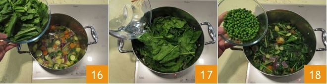 Após esse tempo, adicione os espinafres 16, despeje a água restante 17 e as ervilhas 18. Salgue e continue cozinhando por mais 10 minutos ou até que todos os vegetais estejam macios.