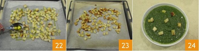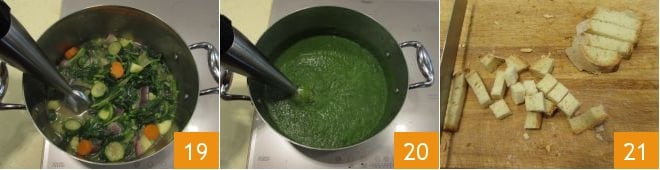 Quando o cozimento estiver finalizado, ajuste o sal e a pimenta e liquidifique os vegetais com um mixer de imersão 19 (você também pode usar um passador de legumes) até obter um creme homogêneo 20. Mantenha o purê de legumes aquecido e prepare os croutons: corte o pão em pequenos cubos 21,