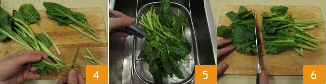 Corte a base dos talos dos espinafres 4, depois lave-os bem em água corrente 5, seque-os e corte-os em 3 partes 6.
