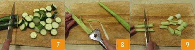 Agora lave e retire as extremidades das abobrinhas, depois corte-as em rodelas grossas como as cenouras 7. Com um descascador de batatas, retire a parte mais externa do talo do aipo, que é mais fibrosa 8, depois corte-o em pedaços grandes 9