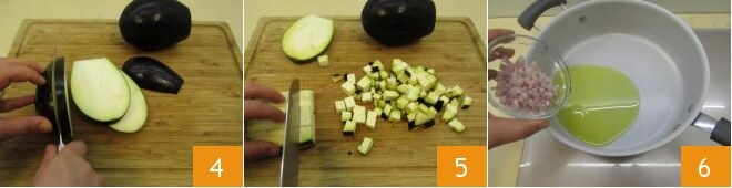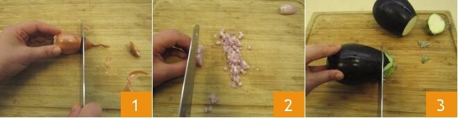 Para preparar o risoto de berinjelas, comece preparando o Caldo de legumes para usar quente. Como alternativa, você pode usar água, mas com o caldo de legumes, o risoto será mais saboroso. Depois, passe para a preparação do refogado: descasque a cebola échalote 1, pique com uma faca 2 e reserve por um instante. É a vez das berinjelas: depois de lavá-las, retire as extremidades 3