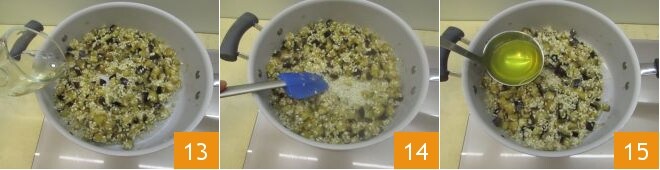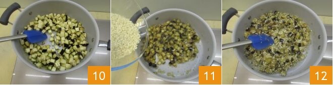 misture 10 e deixe cozinhar por cerca de 4 minutos, sempre em fogo baixo. Depois adicione o arroz 11, mexendo bem para tostá-lo junto com as berinjelas 12.