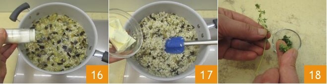 Quando o arroz estiver cozido, adicione uma pitada de sal 16: cuidado para não adicionar muito, pois o caldo já é salgado. Agora você pode desligar o fogo e adicionar a manteiga 17, deixando-a derreter por alguns minutos enquanto mistura. Enquanto isso, retire as folhas dos ramos de tomilho 18