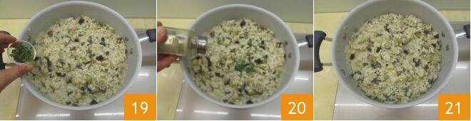 e adicione o tomilho ao risoto 19. Tempere com uma pitada de pimenta-do-reino 20 e sirva 21: seu risoto de berinjelas está pronto para ser apreciado!