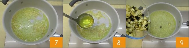 Refogue a cebola échalote em fogo baixo por 4-5 minutos, 7 mexendo ocasionalmente para não grudar. Em seguida, deglacie com uma concha de caldo fervente 8 e deixe cozinhar seu refogado por mais 10 minutos. Passado esse tempo, adicione as berinjelas em cubos 9